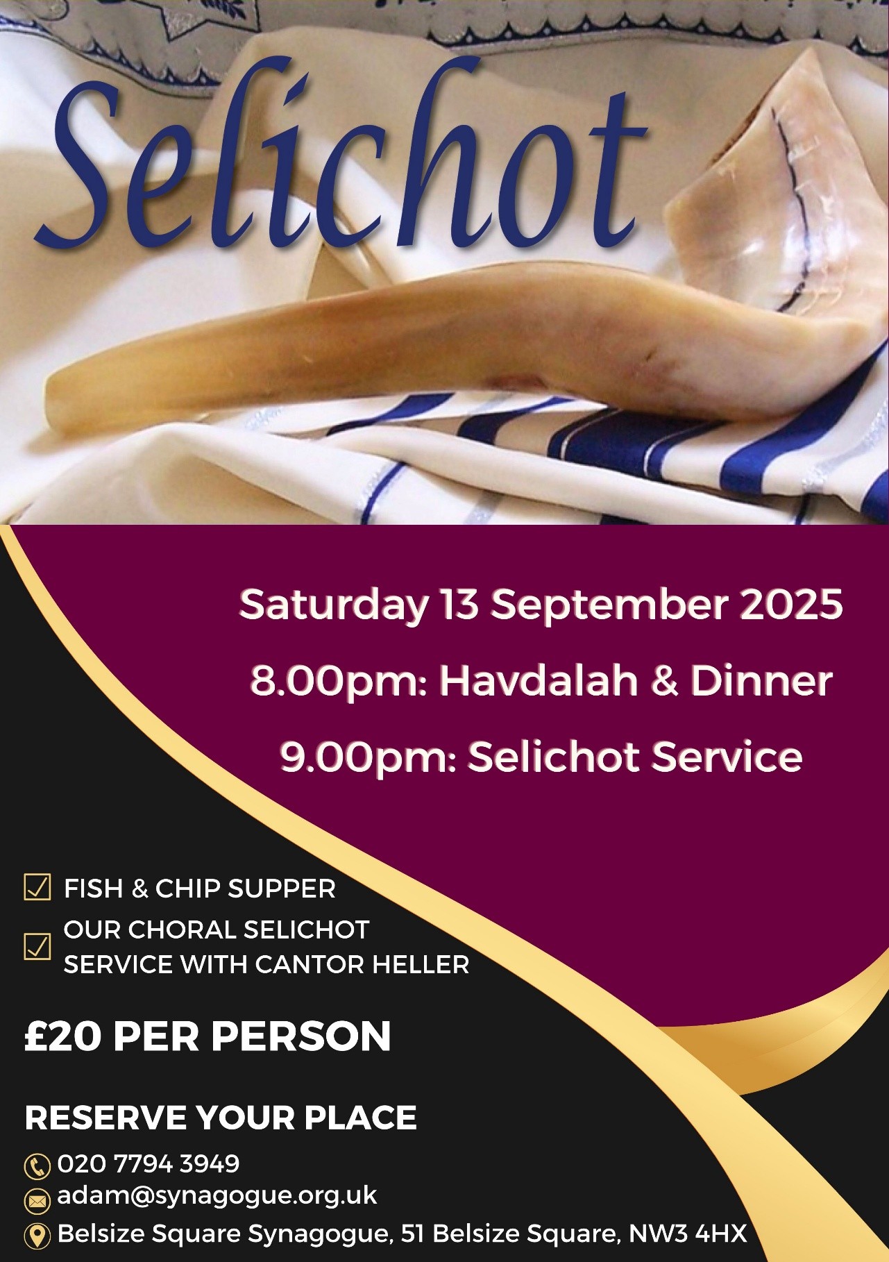 To reserve your place for dinner, email adam@synagogue.org.uk or click here