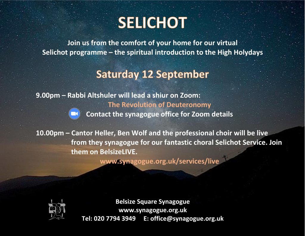 22:00 Choral Selichot service live from the synagogue with Cantor Paul Heller, music director Ben Wolf and the professional choir on BelsizeLIVE