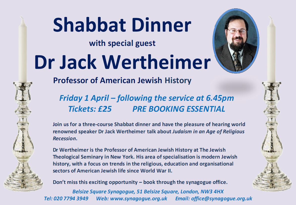 Dinner with special guest Dr Jack Wertheimer, professor of American Jewish history, following the Shabbat evening service. Dr Wertheimer will speak on Judaism in an age of religious recession.