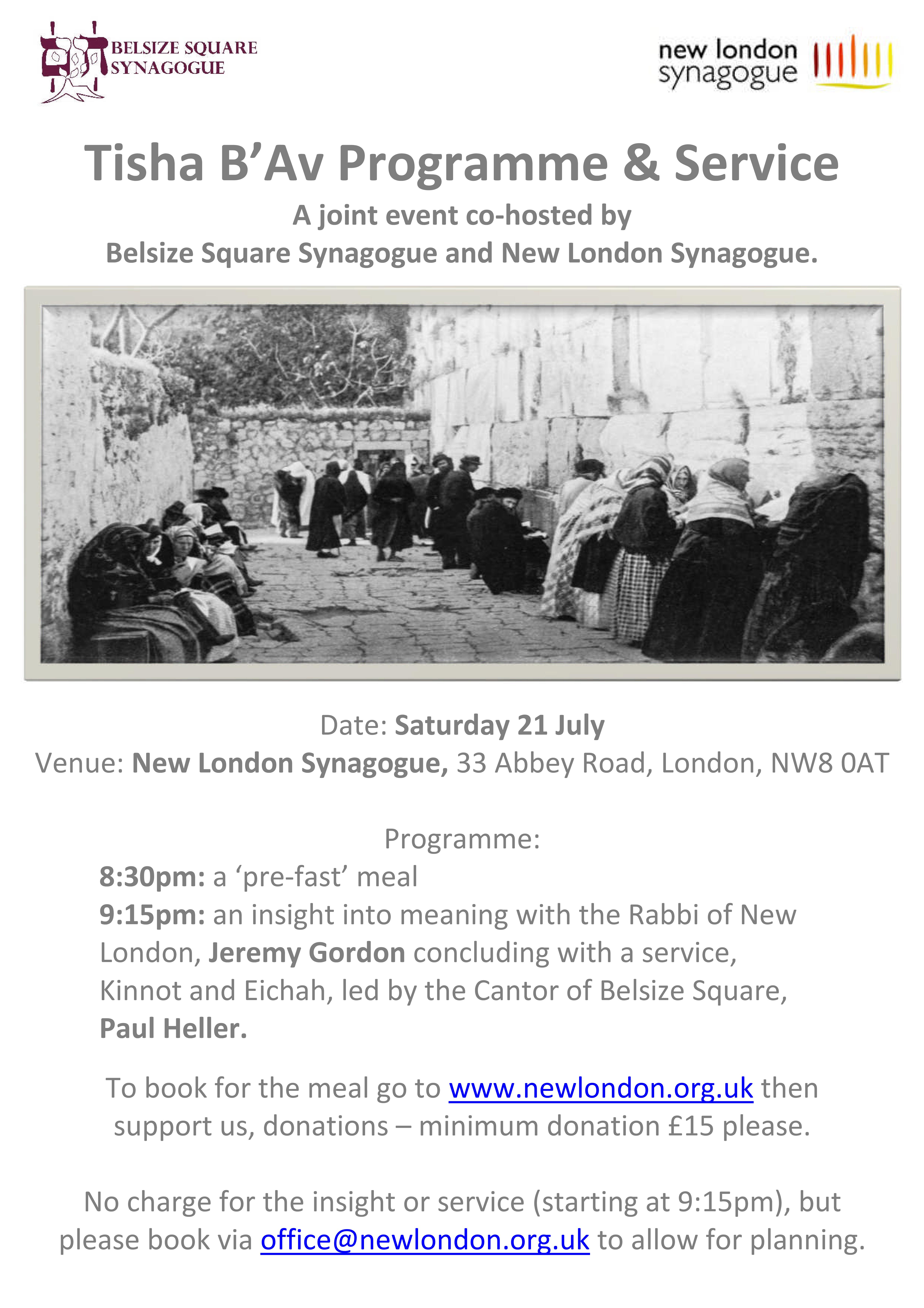 9:15pm: an insight into meaning with the Rabbi of New London, Jeremy Gordon concluding with a Service, Kinnot and Eichah, led by the Cantor of Belsize Square, Paul Heller.
